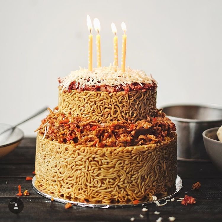 Kalau biasanya kue ulang tahun itu identik dengan yang manis-manis, tapi kini sepertinya masyarakat mulai mencoba dengan sesuatu yang lebih baru dan tidak biasa, yaitu merayakan hari spesial tersebut dengan kue tart yang terbuat dari mie.